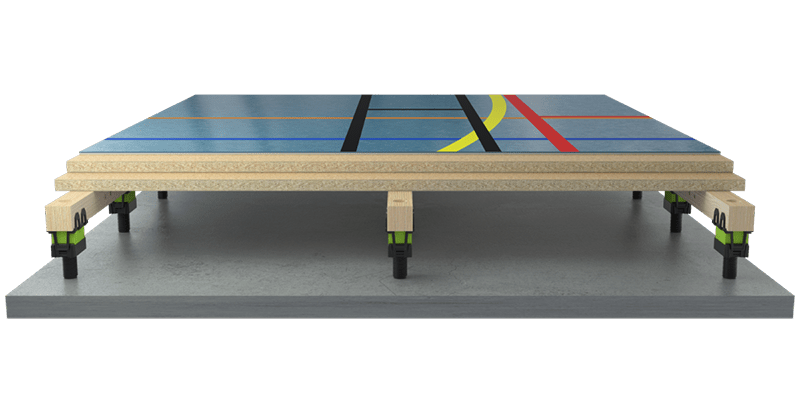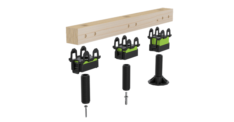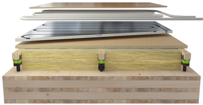 Een Granab systeem is een droog te monteren ondervloeroplossing waarmee je een verstelbare vloeropbouw maakt bovenop bijvoorbeeld beton of CLT, met ruimte voor installaties en met focus op akoestiek