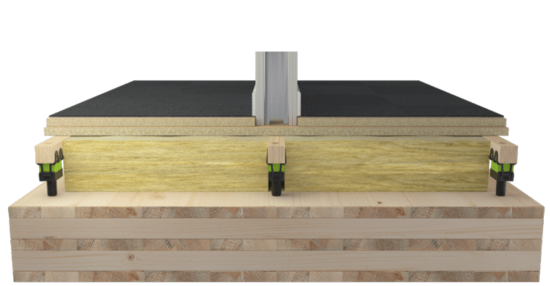 Een ondervloersysteem met een speciaal vervaardigde houten balk, voornamelijk voor CLT vloerconstructies en andere typen houten vloerconstructies, dat zorgt voor effectieve contactgeluid en luchtgeluidisolatie. Deze unieke houten balk is aanzienlijk maatvaster dan een standaard houten balk. Het systeem maakt een droge en snelle installatie mogelijk, waarbij veel installaties kunnen worden weggewerkt in de ruimte tussen het CLT en de vloerplanken. Een nog milieuvriendelijkere optie dan onze stalen liggers, met 50% minder CO2 impact dan beton.