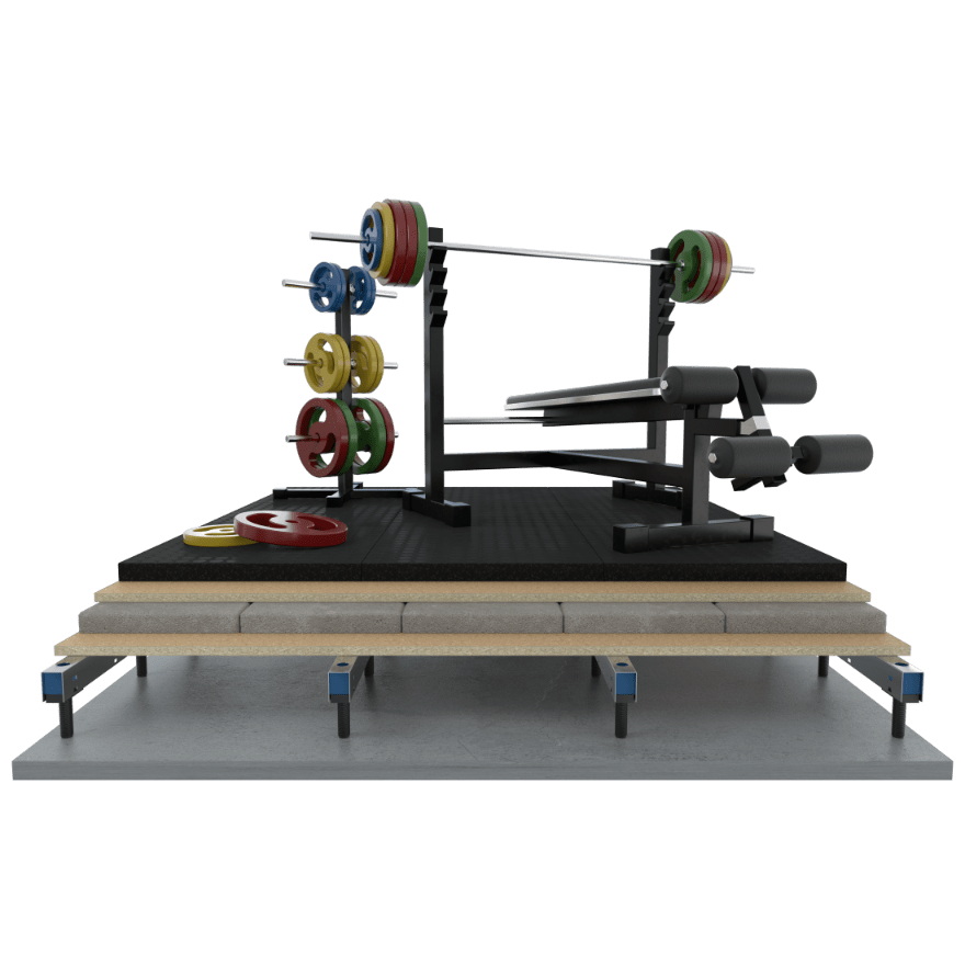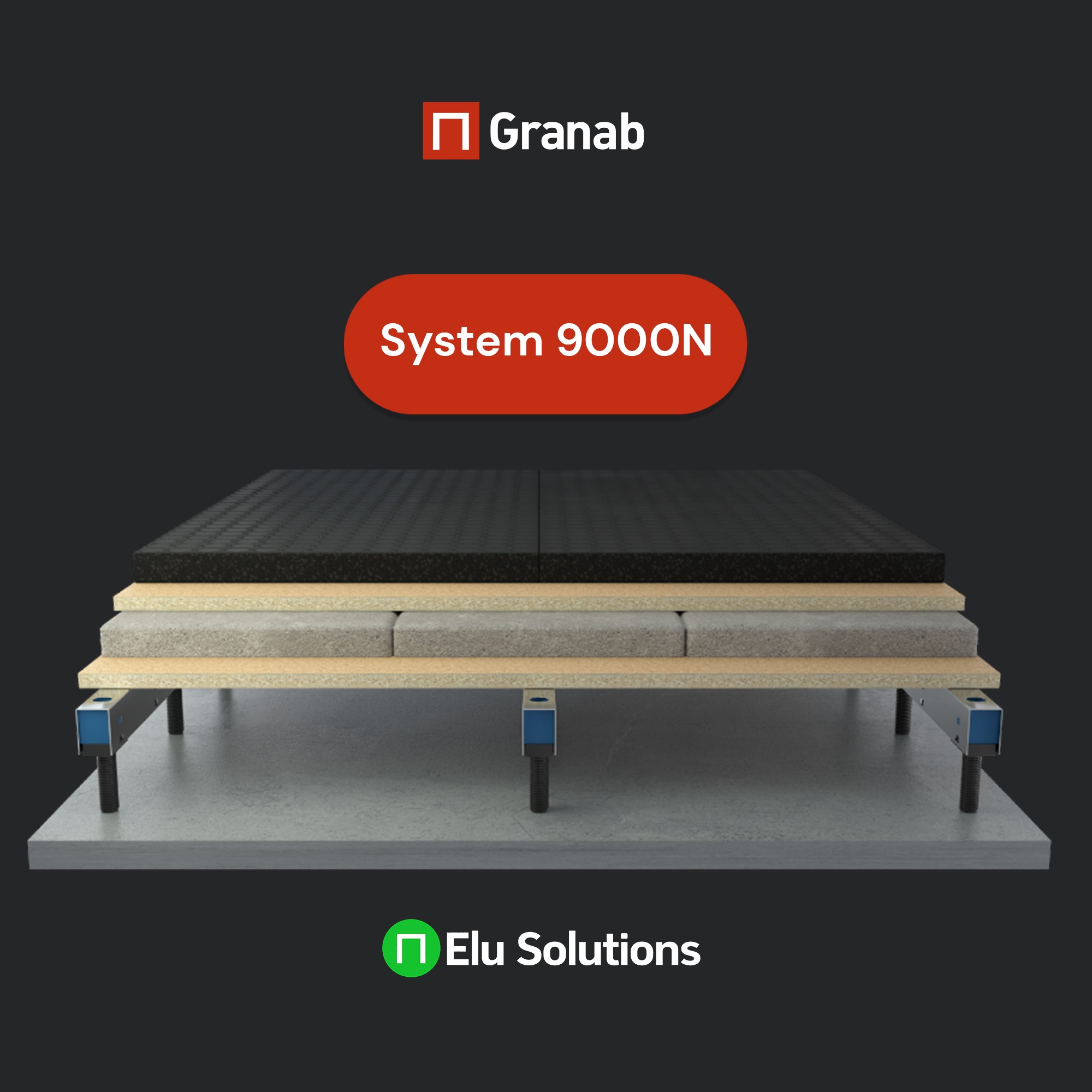 Granab 9000N biedt deze combinatie dankzij zijn verstelbare hoogte (van ongeveer 80 tot 450 mm) en Sylodyn‑dempingselementen van 25 of 50 mm. Dit systeem kan worden afgestemd op de gewenste natuurlijke frequentie van de vloer. Daardoor blijven schokken, trillingen en contactgeluid tot een minimum beperkt, zelfs wanneer men met zware gewichten traint of intensieve cardio‑oefeningen uitvoert.